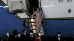 In this image taken from video, Nancy Pelosi leaves her plane in Taipei on Tuesday night.Credit:AP