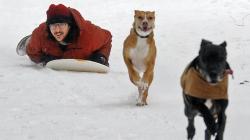 Kevin Barrera and his dogs Janus, right, and Lula, back, try out the sledding hill at Kiwanis Park in St. Joseph, Michigan.Credit:Don Campbell/The Herald-Palladium