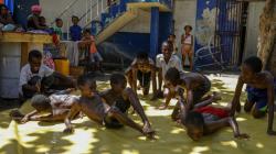 Children play on a slip-and-slide at a shelter for families displaced by gang violence, in Port-au-Prince, Haiti.Credit:AP Photo/Odelyn Joseph