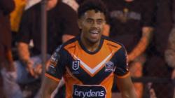Tigers star Jahream Bula dived on a loose ball to score a try against the Sharks.