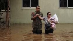 A soldier helps a woman evacuate from a neighbourhood in Canoas flooded by heavy rain.Credit: AP