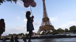 Jenna Baltes, 8, of St. Paul, Minn., holds balloons while walking along the Seine river in front of the Eiffel Tower with her family during the 2024 Summer Olympics in Paris.Credit:AP
